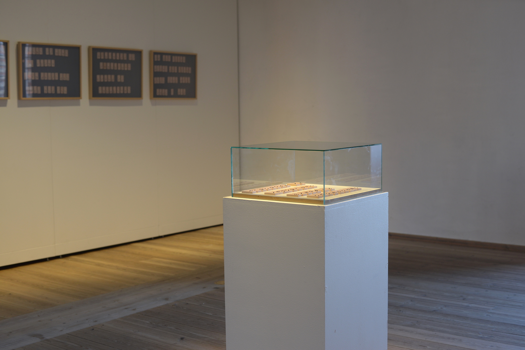 This work consists of several subparts and using several media and forms, it constitutes a polyphonous entity. One photograph on the wall has captured a snapshot of a table that is physically located in the room, and the table covered by Domino pieces is the central stage of several performances.